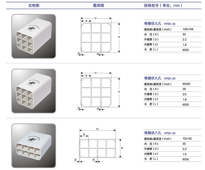 “豐”牌PVC九孔柵格管適用于通信光纜的穿導、隔離及保護,廣泛應用于光纖通訊、有線電視、多媒體傳輸等工程。